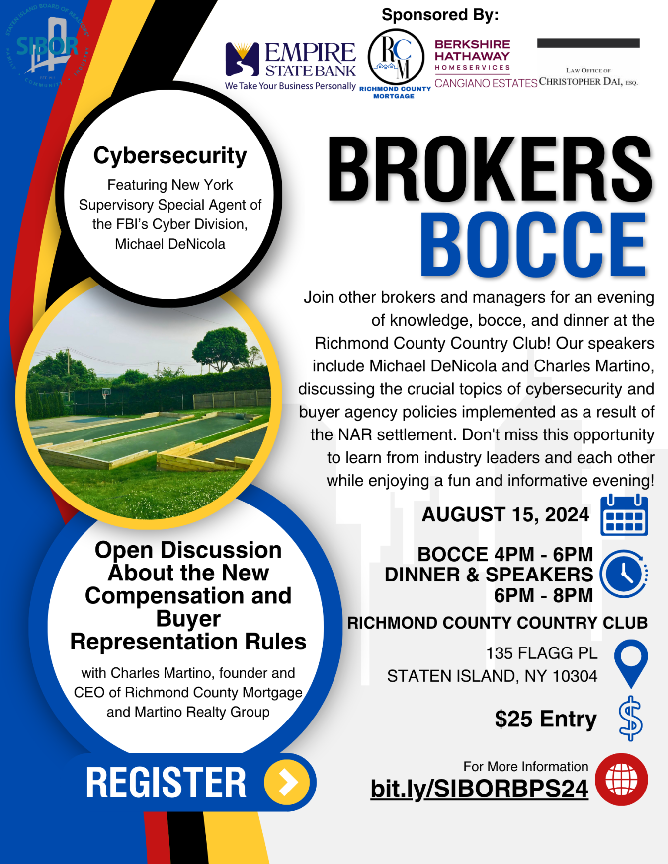 $25 included the Bocce Tournament (first come first serve- limited spots) and dinner at the Richmond County Club, with expert speakers on: Cybersecurity from the FBI and Buyer Representation.